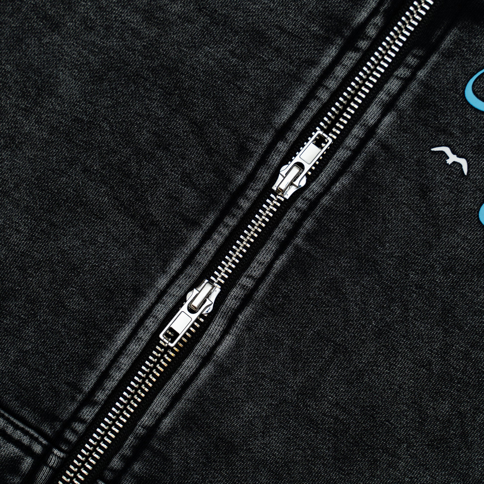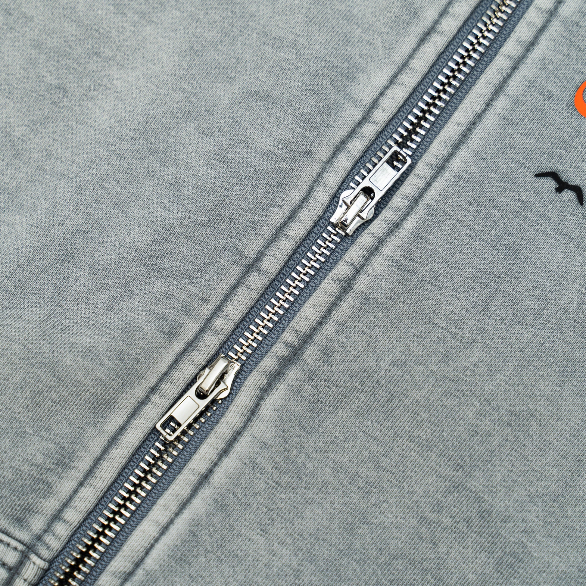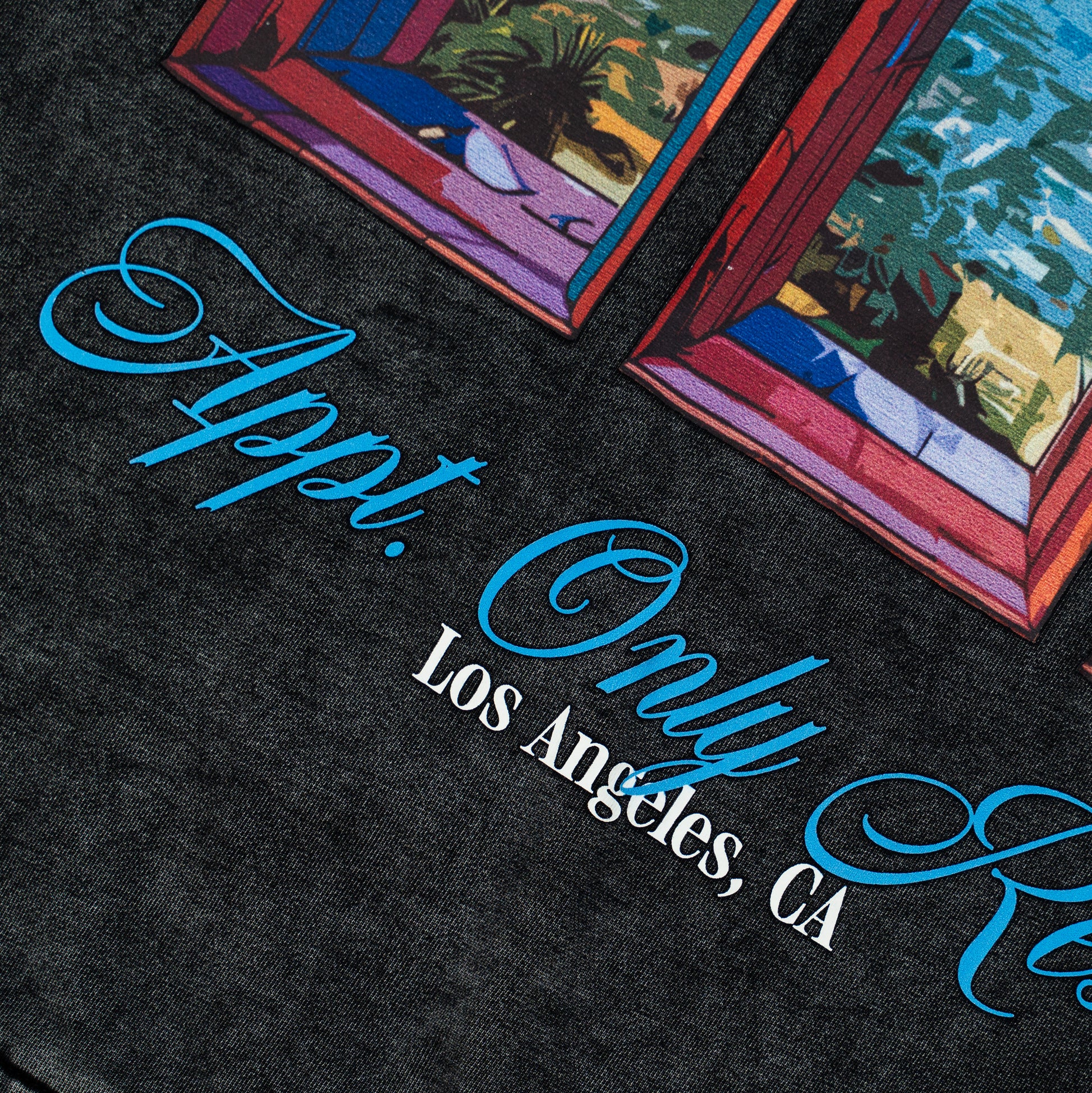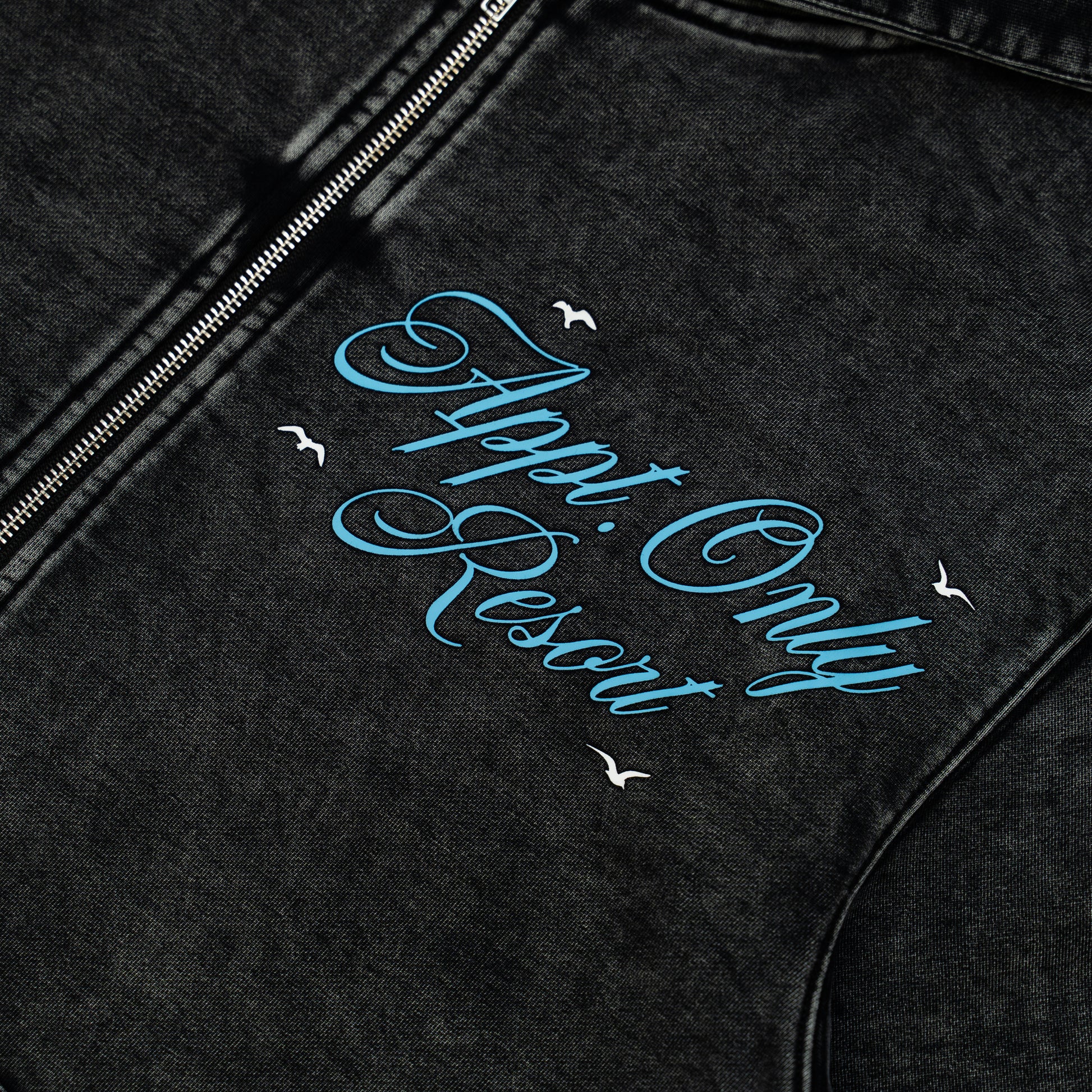 Worn-in comfort. All-weather weight. Garment-washed for a vintage hand feel. Resort signage and classic hotel script.