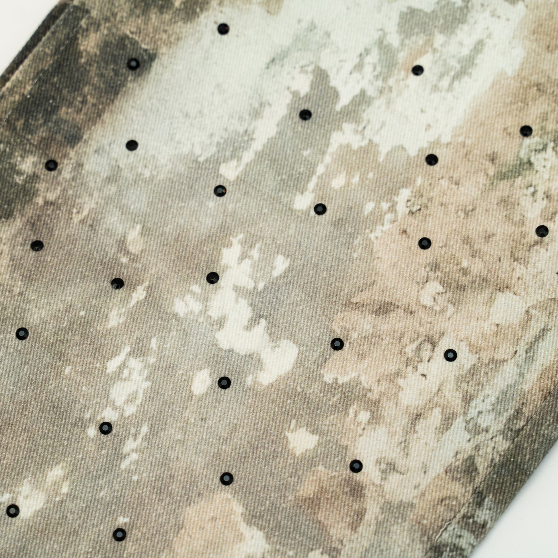 Custom camo printed on artist-grade canvas denim — no two pairs alike. Rivet detailing down the leg. Embroidered “888” stamp on the back pocket, gratitude for the fortune that brought us here.