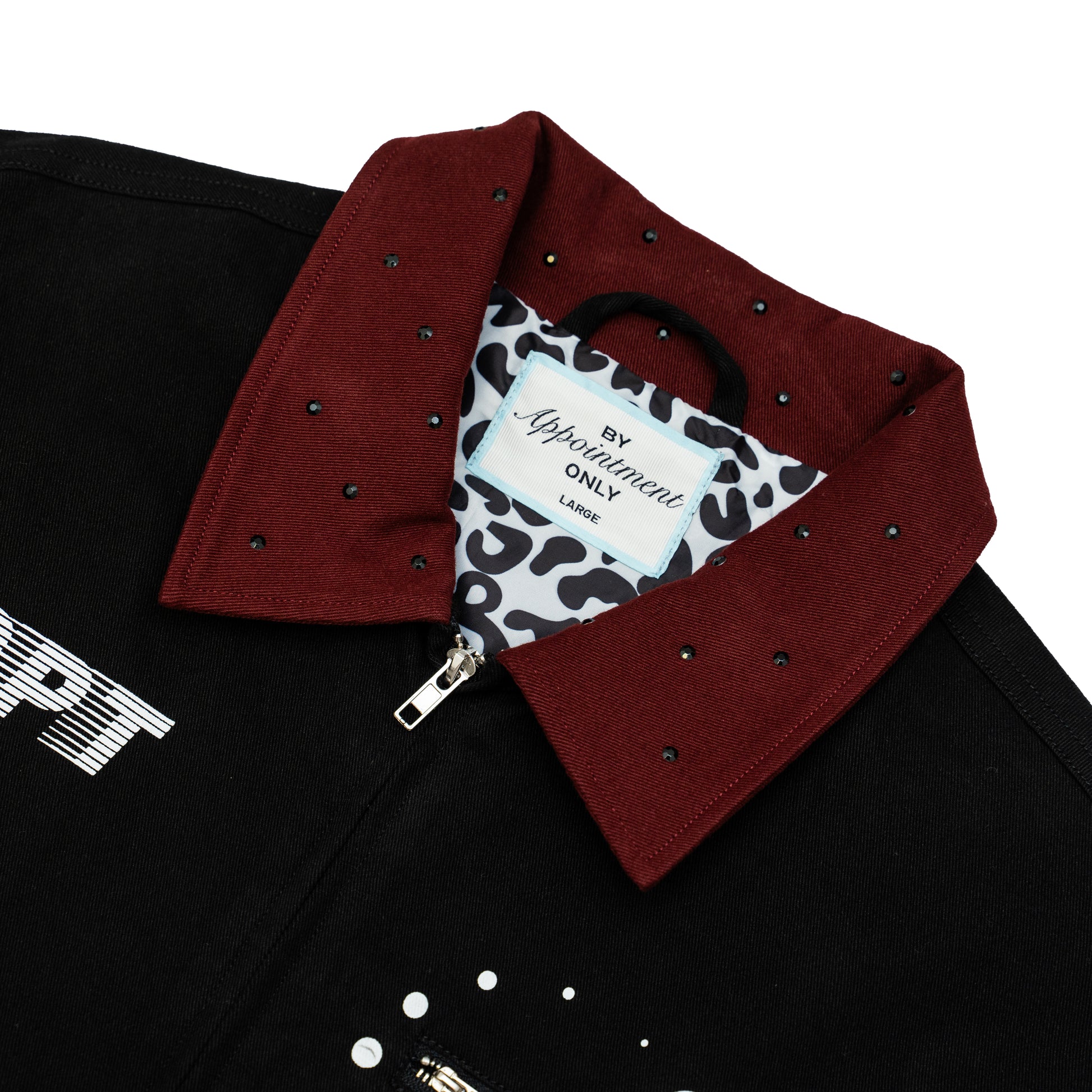 Cut from heavyweight black cotton with a contrast oxblood collar. Custom rivet detailing at collar and sleeve. Embroidered insignias throughout. Lining in black/white leopard print.