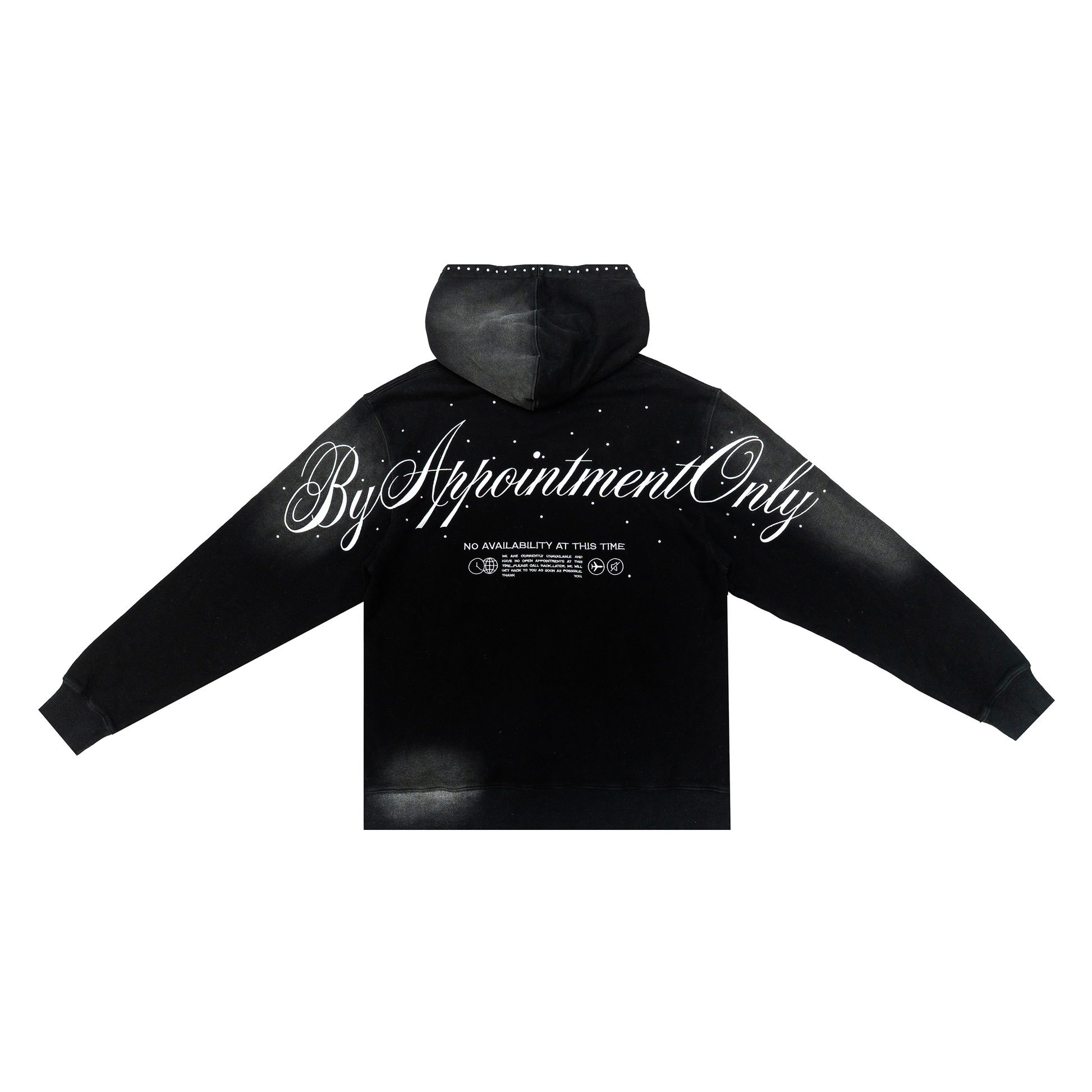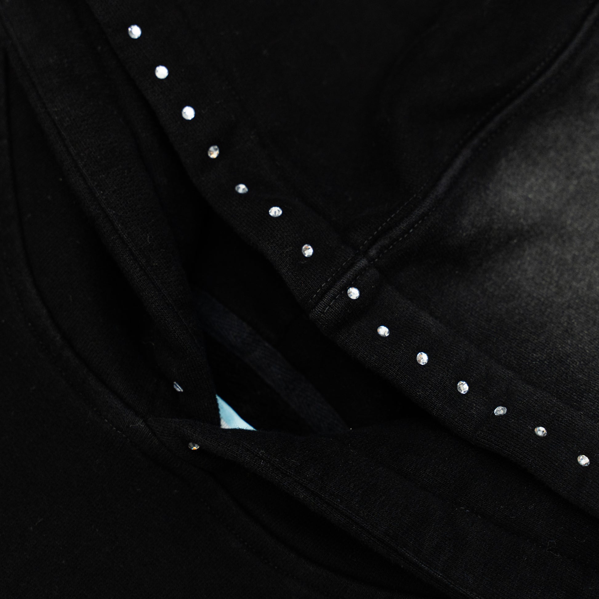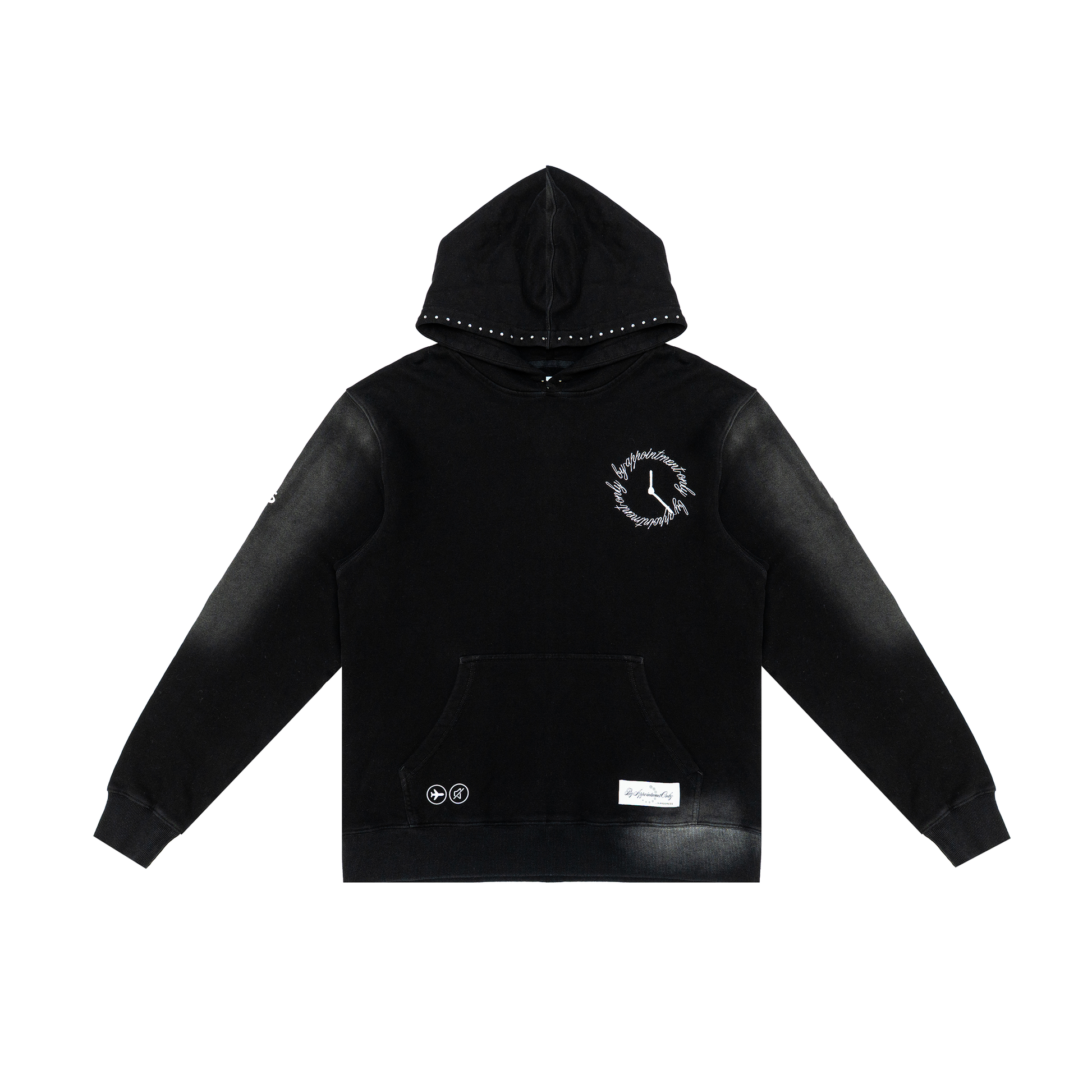 Relaxed fit. Vintage wash. Pigment-dyed hoodie featuring tonal crystal rivet detailing, embroidered cursive clockwork motif, and layered artwork. Crystal-embellished hoodie lining and back graphic.